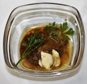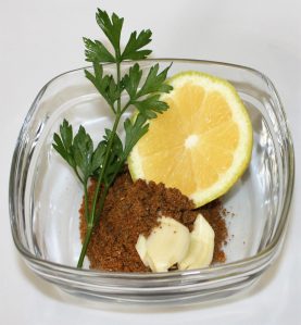 Para macerar la carne vamos a utilizar esta mezcla de especias con el zumo de medio limón, un ajo pelado y aplastado ( simplemente cuando lo tengáis pelado le dais un golpe colocando un cuchillo encima ), el perejil y las tres cucharadas de aceite.