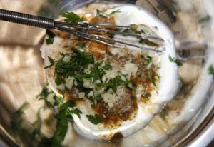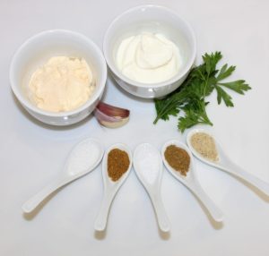 Mezclar bien todos los ingredientes: ajo y perejil picados, yogur, mayonesa, curry, comino, pimienta, sal y azúcar y….LISTO. Esta buenísima.