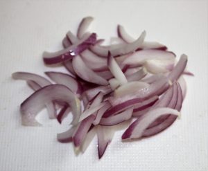 Eliminar las partes blancas y las semillas del pimiento y cortarlo en tiras.