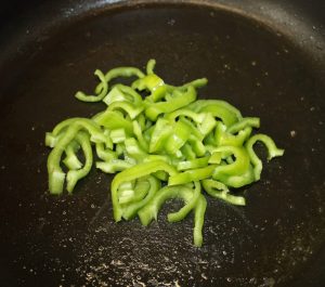 Mientras la carne se hace, dorar el pimiento en la misma sartén donde hemos hecho la carne. 3 minutos a fuego medio.