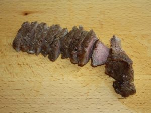 Poner en una fuente de horno y meter a 220º, 10 minutos. La carne debe quedar ligeramente rosada por dentro, si los filetes son finitos, con 5 minutos suficiente.