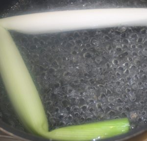 En un cazo con agua y una cucharadita de sal blanquear la hoja de puerro. Cuando comience el agua a hervir, introducir 1 minuto.