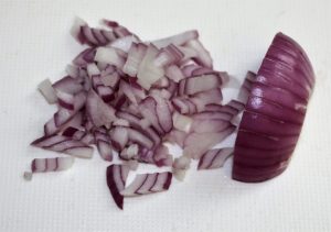 Pelar la rodaja de tomate, quitar las semillas y cortar en dados.