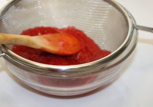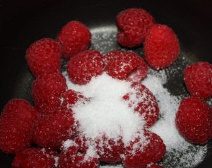 Poner en un cazo las frambuesas con 20 g de azúcar.