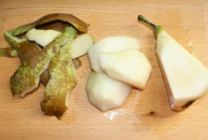 Pelar las peras y cortar en cuartos, evidentemente sin las pepitas.
