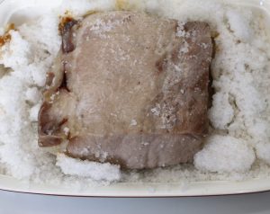 Sacar el lomo del horno. Bajar la temperatura del horno a 180º que va a ser la necesaria para las peras.