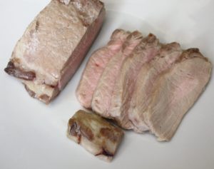 Quitar si algún lateral tiene un exceso de grasa y cortar en rodajas. Veréis que el centro queda ligeramente rosado y muy jugoso.