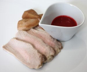 Servir las rodajas de lomo con las peras y la salsa aparte….