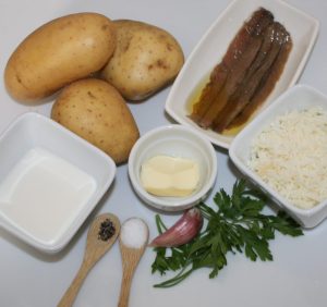 Mezclar el puré de patata con el sofrito de ajo y perejil y dos anchoas troceadas.