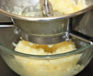 En un bol mezclar las patatas peladas con la leche, la mantequilla a temperatura ambiente y la pimienta.