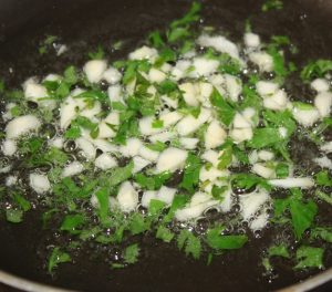 En una sartén con 1 cucharada de aceite dorar el ajo y perejil, 1 minuto a fuego medio.