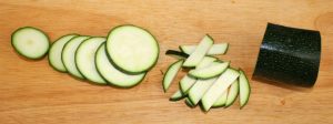 Cortar el calabacín en rodajas y después en bastones.