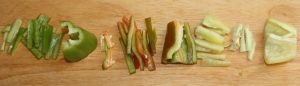 Quitar las semillas y partes blancas de los pimientos y cortar en bastones.