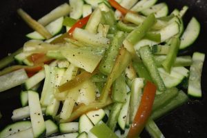 Poner una sartén al fuego con 3 cucharadas de aceite virgen extra. Cuando el aceite esté caliente añadir la cebolla y los pimientos. 10 minutos a fuego suave moviendo. Añadir el calabacín. Salpimentar. Rehogar 3 minutos más.