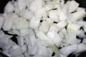 Pochar en una sartén con 4 cucharadas de aceite. Salpimentar. Fuego fuerte y en cuanto el aceite comience a chisporrotear bajar al mínimo y tapar.