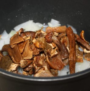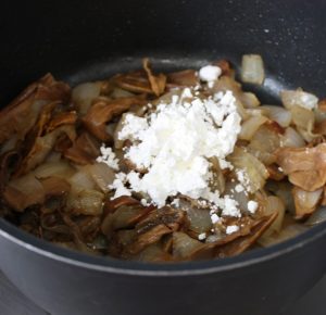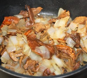 Añadir a la sartén con la cebolla. Destapar y dejar a fuego medio hasta que se evapore toda el agua que sueltan las setas.