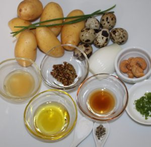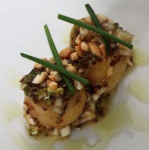 Colocar en cada plato dos patatitas, regar con la vinagreta, espolvorear con unos cuantos anacardos picados y terminar colocando encima cebollino.