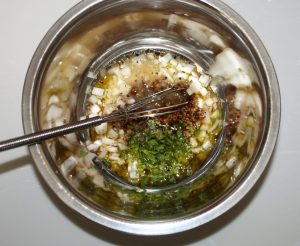 Mientras tanto hacer la vinagreta: mezclar en un bol el aceite, vinagre, miel, mostaza, perejil, cebolleta, sal y pimienta.