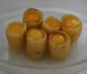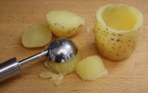 Cuando las patatas ya estén frías vaciarlas con un sacabolas. No tiréis la patata que habéis vaciado, aprovecharla para hacer por ejemplo una ensalada.
