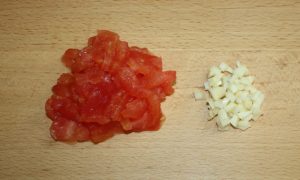 Escaldar los tomates. Pelar, eliminar las semillas y cortar en concassè.
