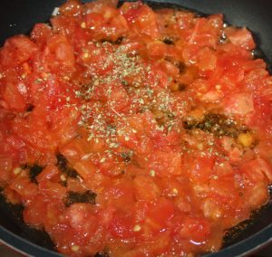 Añadir los tomates, azúcar, una pizca de sal y orégano. 5 minutos a fuego medio.