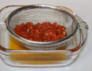 Cuando esté hecha la salsa de tomate colarla y reservar el aceite, lo vamos a utilizar para el emplatado.
