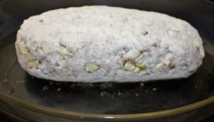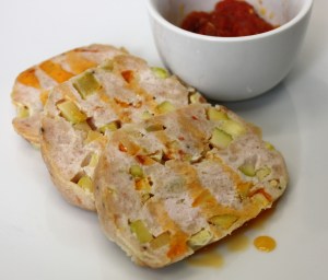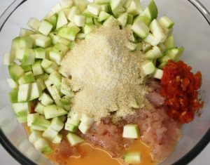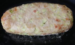 Darle forma alargada, como de pan. Si queda muy blanda y no la podéis manipular, añadir un poco más de pan rallado. En ocasiones al darle forma se escapan algunos dados de calabacín, no pasa nada, volverlos a introducir en la masa.