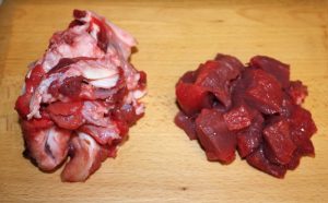 Eliminar el exceso de grasa y trocear la carne en dados grandes, como para estofado.