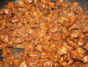 Introducir en este bol los trozos de carne y mezclar bien para que quede bien rebozada por todos lados.