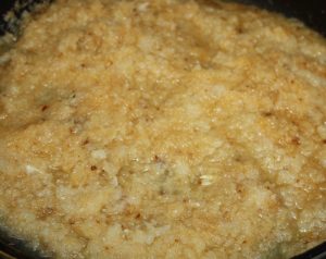 En la misma sartén donde hemos dorado la carne, freír la cebolla y el ajo. 5 minutos a fuego medio. Salpimentar.
