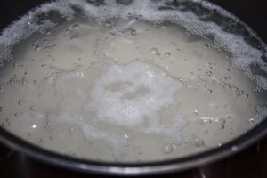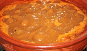 Mientras tanto en una cazuela honda de barro, o la que tengáis, poner a calentar el caldo de carne. Para hacer este caldo utilizar los mismos ingredientes que os dí en la recete de fondo de ternera pero de manera más sencilla. No hace falta dorar los huesos en el horno, simplemente ponerlos en una olla con agua y dejar cociendo 1,5 horas o en la olla rápida 15 minutos. Yo he utilizado medio vaso de fondo de ternera que tenia congelado y le he añadido litro y medio de agua. Otra opción es disolver en el agua una pastilla de caldo de carne.
