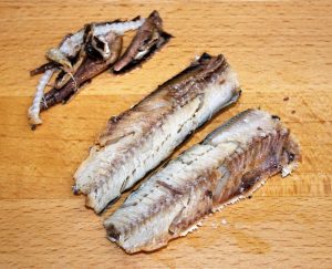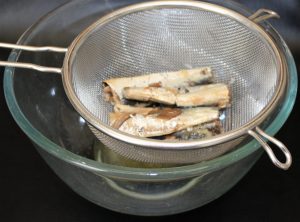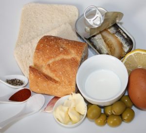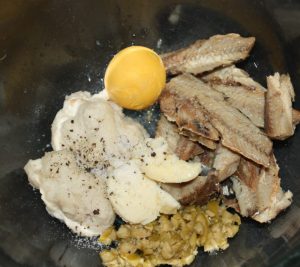 En un bol poner las sardinas, las aceitunas picadas, el pan escurrido, la mantequilla, la yema de huevo duro, el zumo de limón, sal y pimienta.