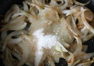 Momento de poner el azúcar. Bajar el fuego al mínimo y tapar. Dejar hasta que la cebolla esté muy blandita, unos 5 minutos. Mover a menudo para que no se queme.