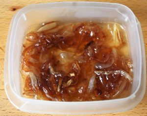 Poner las hojas de gelatina a remojo en agua fría. Dejar 5 minutos, es suficiente para que se hidraten. Escurrirlas con las manos y añadirlas a la sartén donde tenemos la cebolla caliente. Retirar del fuego y poner en un taper rectangular y bajo. A la nevera 2 horas para que solidifique.
