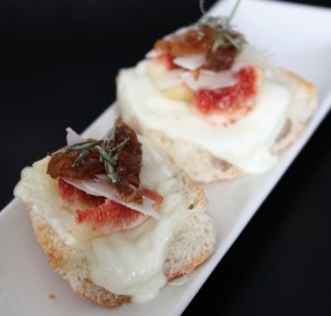 Sacar el pan del horno, colocar sobre el queso unos gajos de higos, lascas de parmesano, gelatina de cebolla y culminar con unas hojitas de romero.