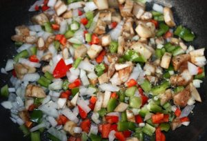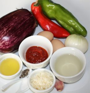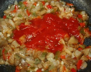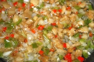 Picar la carne que hemos vaciado de las berenjenas, los pimientos, sin pepitas, la cebolleta y el ajo.