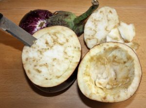 Cortar los extremos de la berenjena y partir por la mitad de modo que nos quedarán dos partes de unos 5-6 cm.