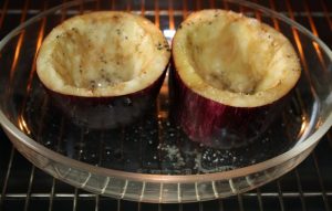 Salpimentar las berenjenas. Poner en una fuente de horno con un poco de aceite para que no se peguen. 10 minutos. Tapar con papel de aluminio y dejar 5 minutos más.
