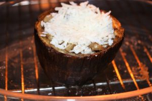 Rellenar media berenjena con la pulpa y poner encima el queso. Introducir en el horno a 220º, con el grill, durante 5 minutos.
