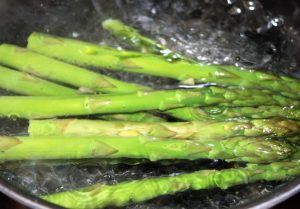 En un cazo con agua y una cucharadita de sal escaldar los espárragos. 3 minutos y pasar a un bol con agua y hielo para cortar la cocción.