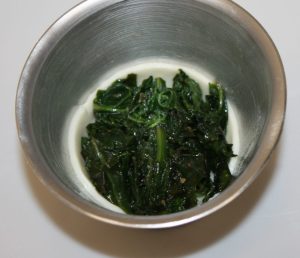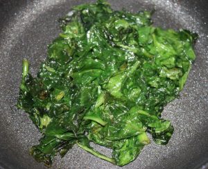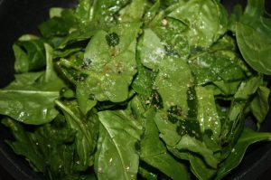En otra sartén con dos cucharadas de aceite saltear las espinacas con una pizca de sal y pimienta.