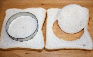 Cortar círculos de pan. Por supuesto los recortes nunca se tiran. Por ejemplo podéis hacer con ellos tostones.