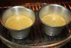 Precalentar el horno a 170º. Meter una bandeja de horno con dos dedos de agua durante 10 minutos, para que el agua se vaya calentando. Colocar las dos flaneras, las vamos a hacer al baño maría, 15 minutos aproximadamente. Para comprobar que están bien cuajadas pinchar, el pincho debe salir limpio.