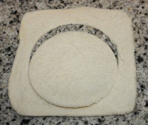 Con un cortapastas, o un vaso, hacer círculos en dos de las rebanadas. Serán las palmas de las manos.