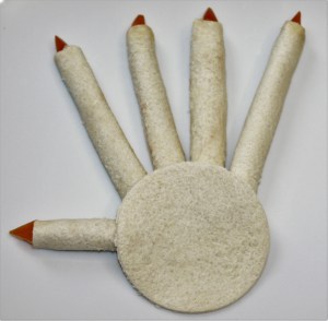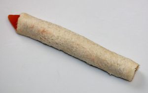 Enrollar con cuidado para que no se rompa el pan y colocar en un extremo un triangulo de tomate, será la uña de nuestras garras. Una de las rebanadas cortarla por la mitad para hacer los dos dedos gordos.