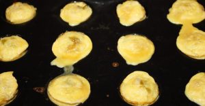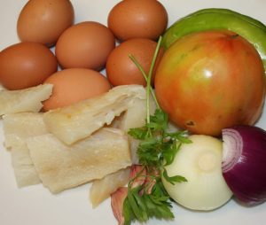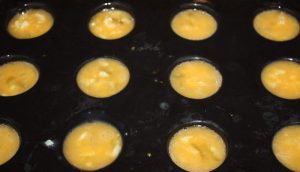 Batir 6 huevos y añadirles el sofrito de bacalao. Mezclar bien. Rellenar los moldes de silicona.