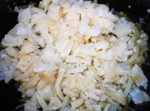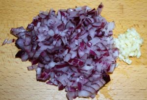 En la misma sartén donde hemos pochado el bacalao, poner la cebolla morada y el ajo. 3 minutos a fuego bajo.
