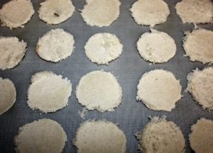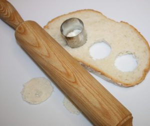 Con un cortapastas hacer círculos con las rebanadas de pan. Si no tenéis cortapastas hacerlo a mano o con un vaso.