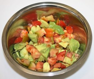 Añadir los dados de bogavante al bol donde tenemos el tomate y el aguacate. Aliñar con la vinagreta y mezclar bien.