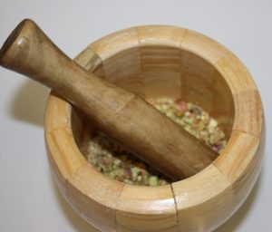 En un mortero machacar los pistachos. Le van a dar un toque crujiente a la ensalada.